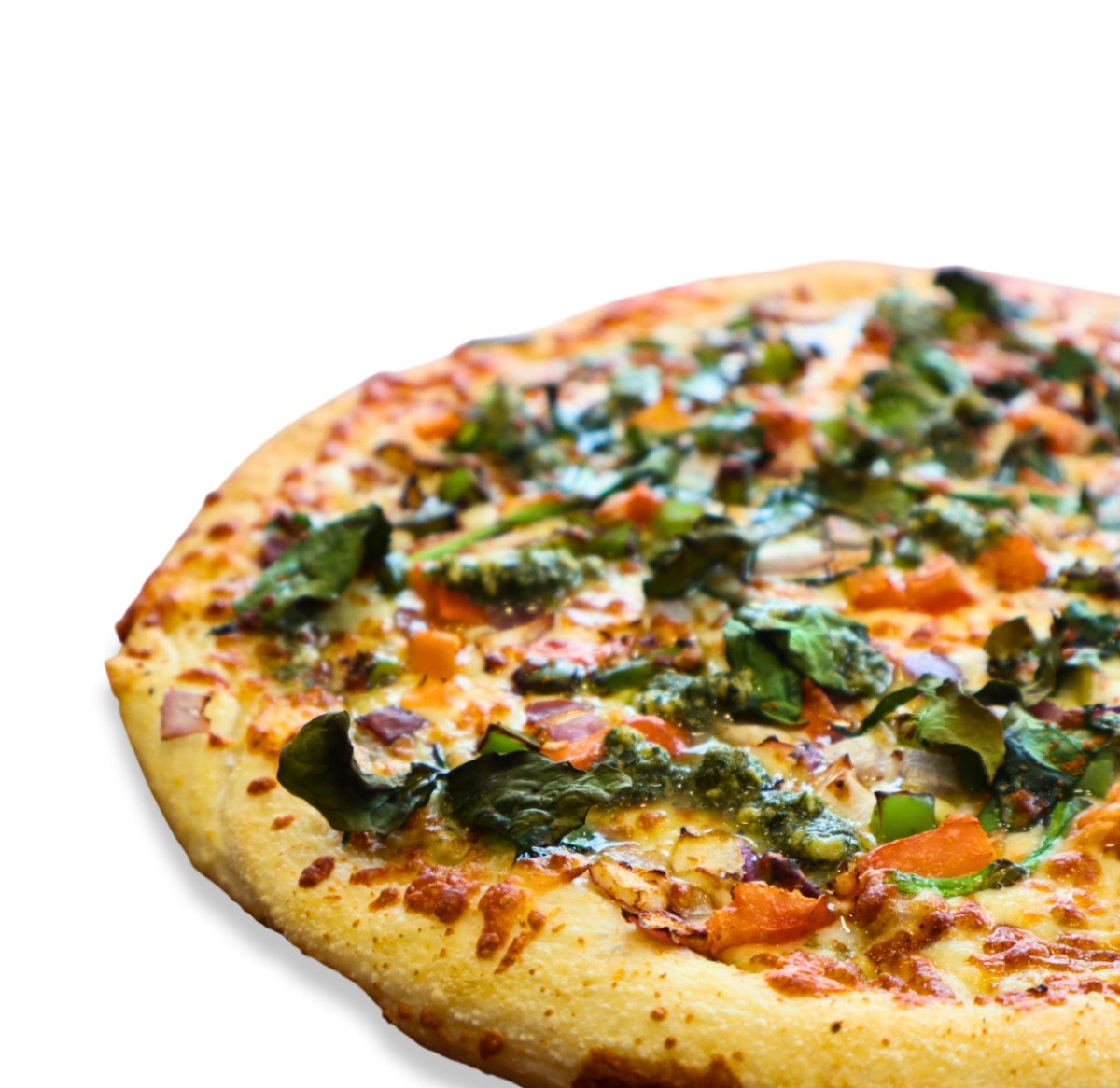 Garlic, Spinach, Onions, Green Peppers, Tomatoes, Mozzarella Cheese, Pesto Sauce